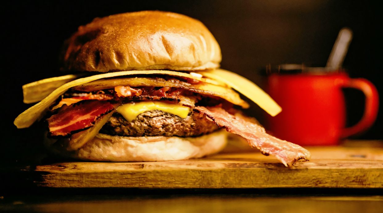 Домашен бриош, телешко patty 2 броя, зелена салата, домат, печен лук, кисели краставички, двоен чедър, спейс сос