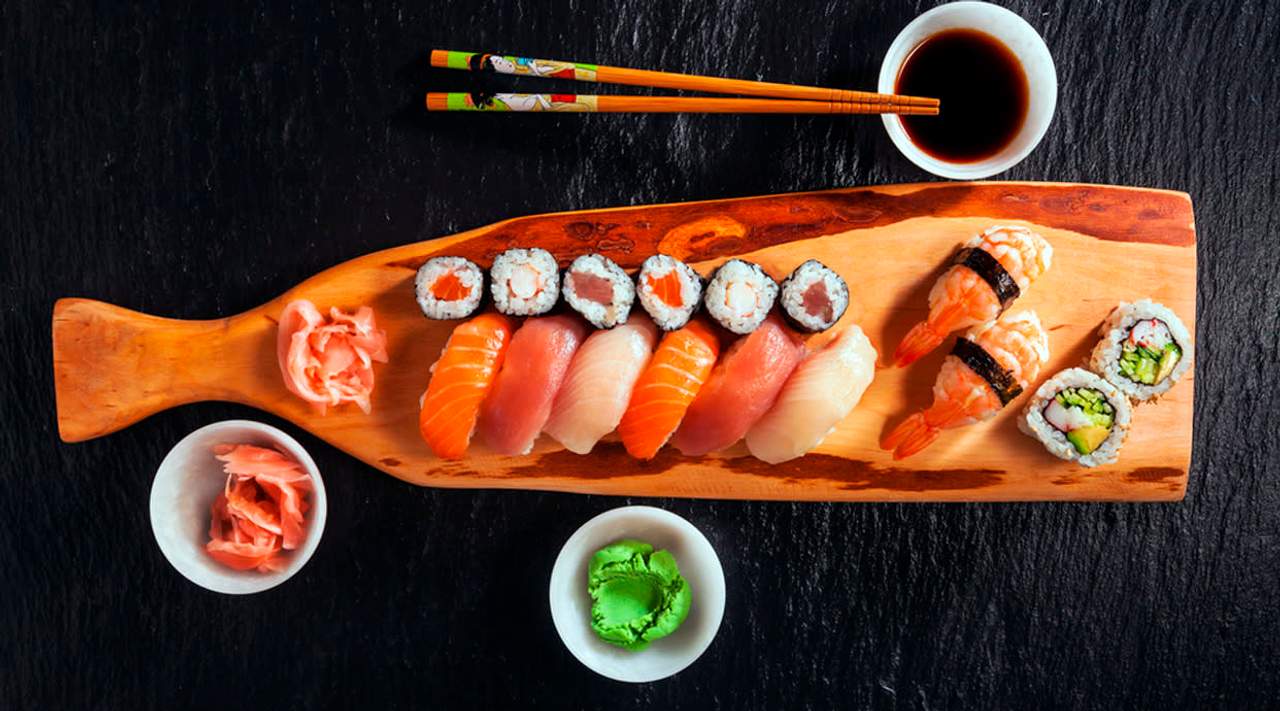 2 Sushi salmón, 2 sushi atún, 2 sushi pez mantequilla, 2 sushi ebi, 4 maki salmón y 4 maki atún
