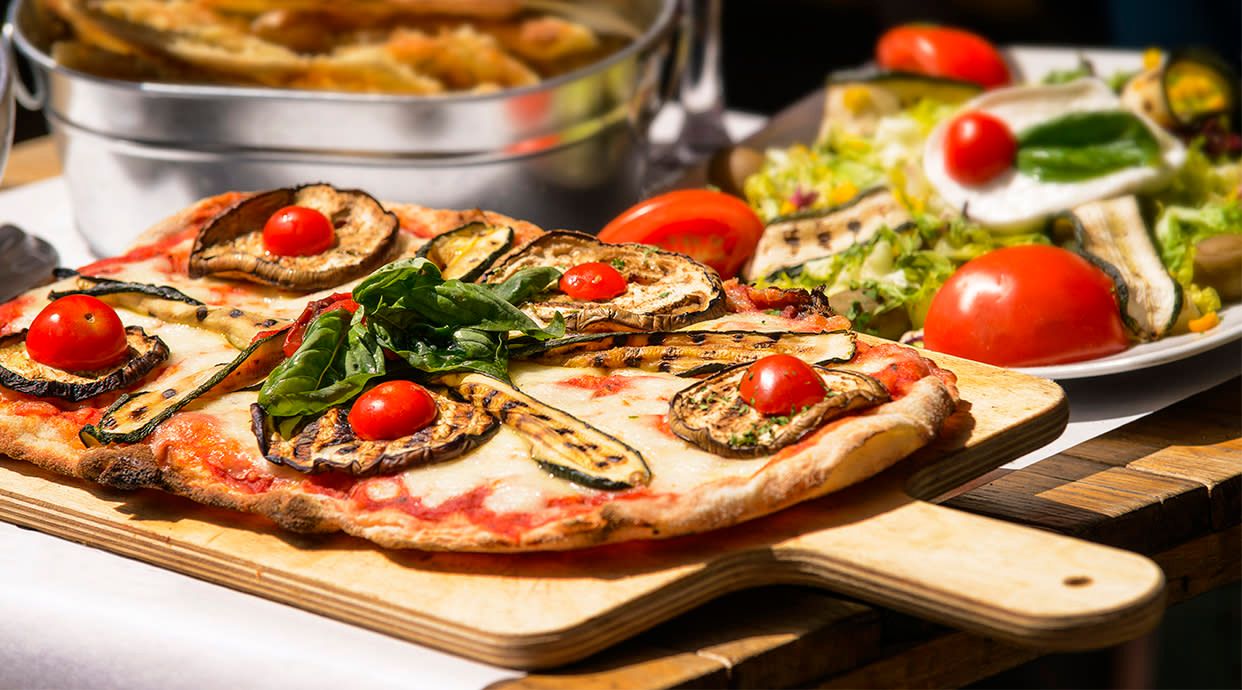 Tomate, mozzarella, piquillo, calabacín, berenjenas, orégano.