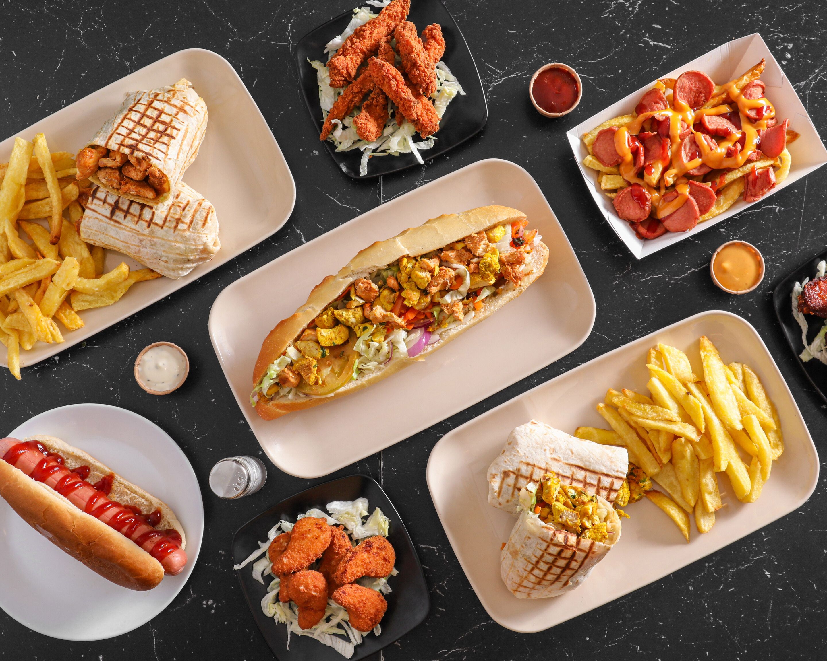 Bocata o wrap a elegir, patatas fritas caseras con una salsa y refresco