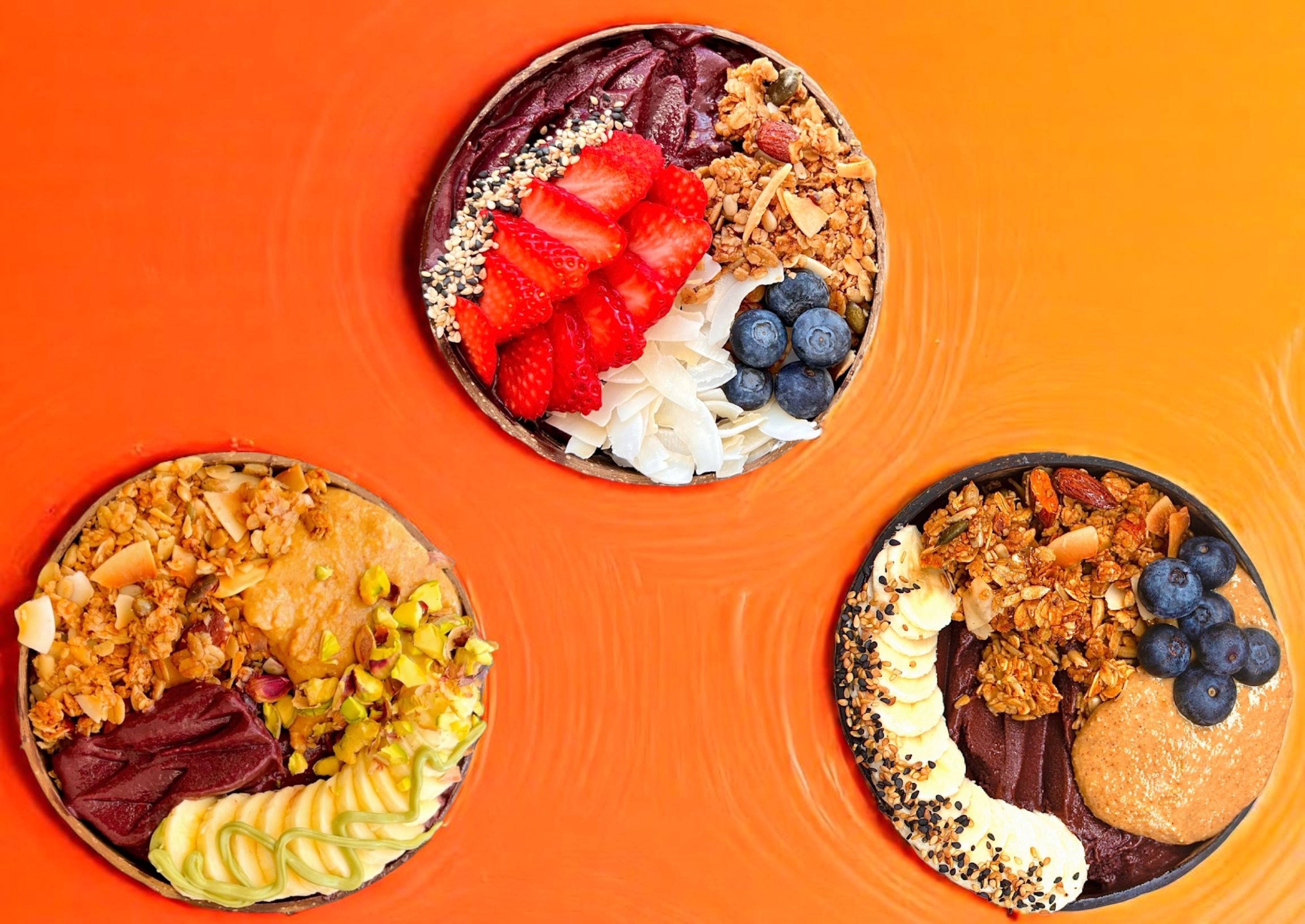 Contiene: Base: plátano, açaí orgánico Toppings: Granola casera, plátano, mantequilla de maní, pistacho, crema de pistacho, mix de semillas