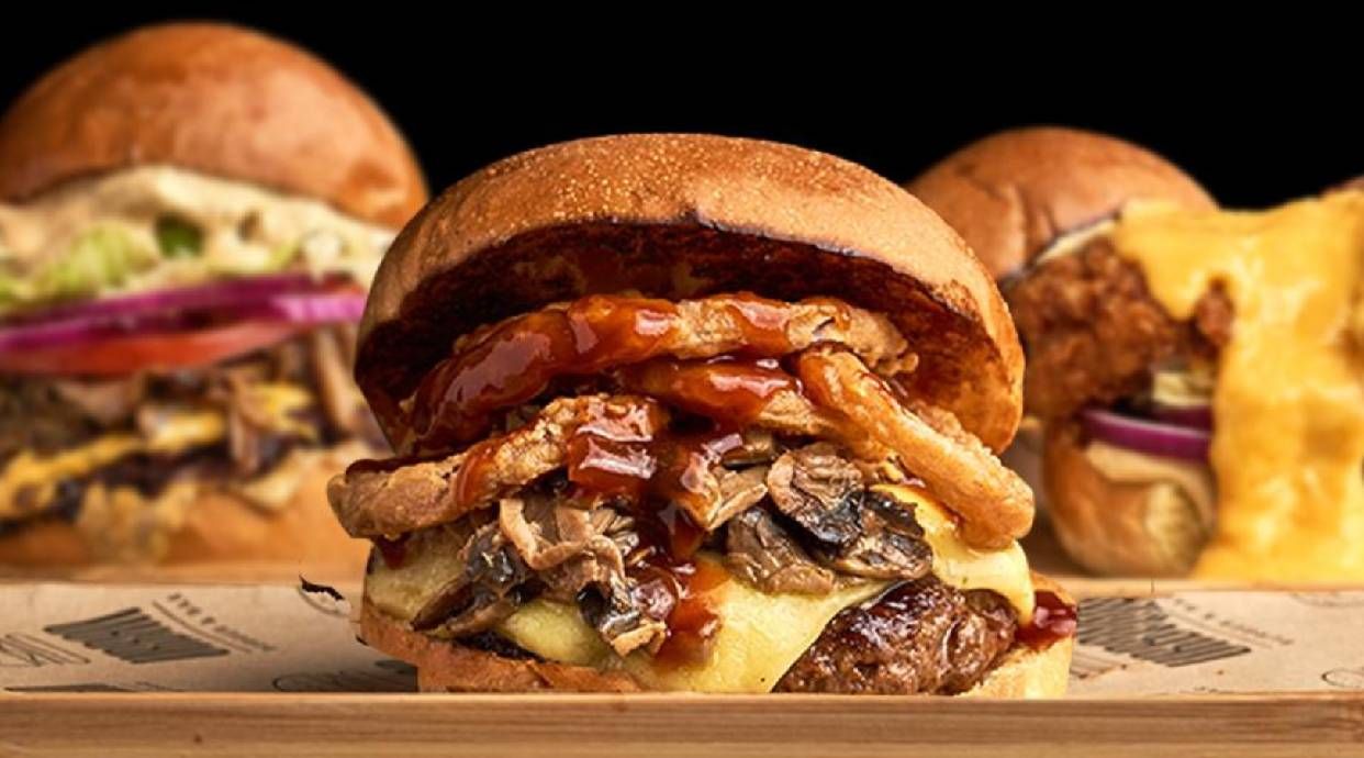 180 g de mezcla de carne de vaca angus premium con vegetales, dos lonchas de queso cheddar curado, aros de cebolla rebozados, champiñones y barbacoa ahumada casera.