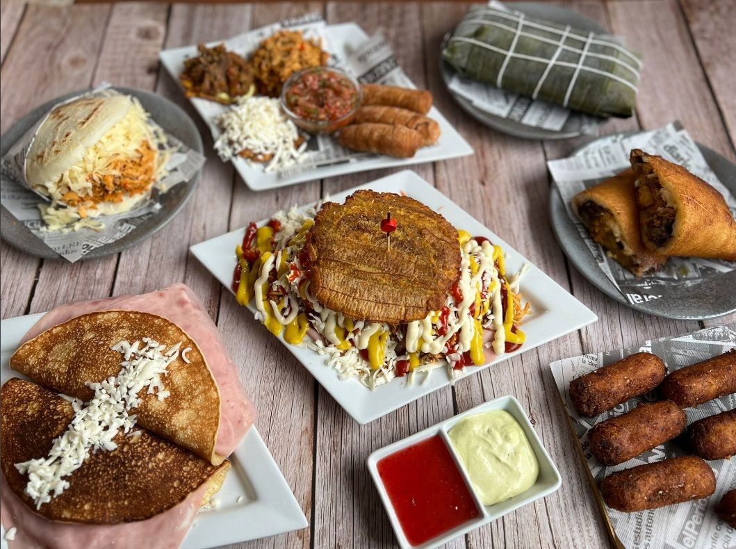 Plato de pollo , caraotas (alubias), plátano frito , queso latino , huevo , aguacate y para acompañar dos arepas