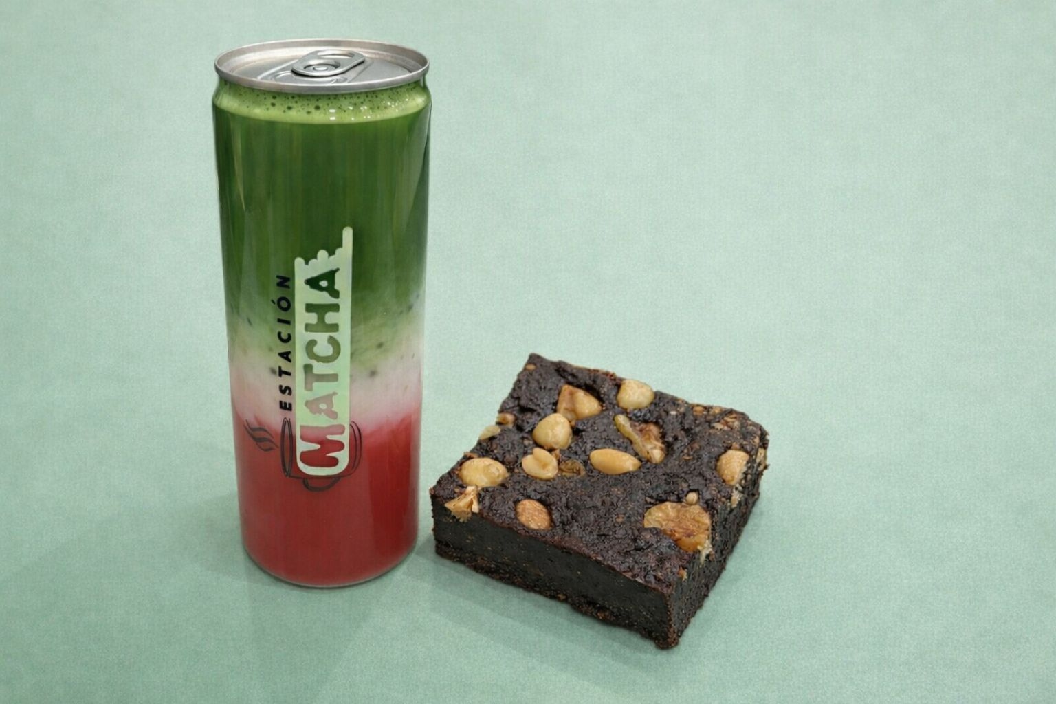 Combinado de matcha latte con brownie de cacao, coco, nueces, pistacho y cacahuete. Sin gluten y sin azúcar.