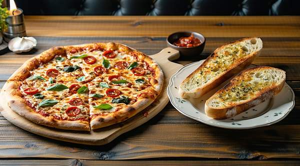Pan tostado cubierto con tomate fresco, ajo y albahaca