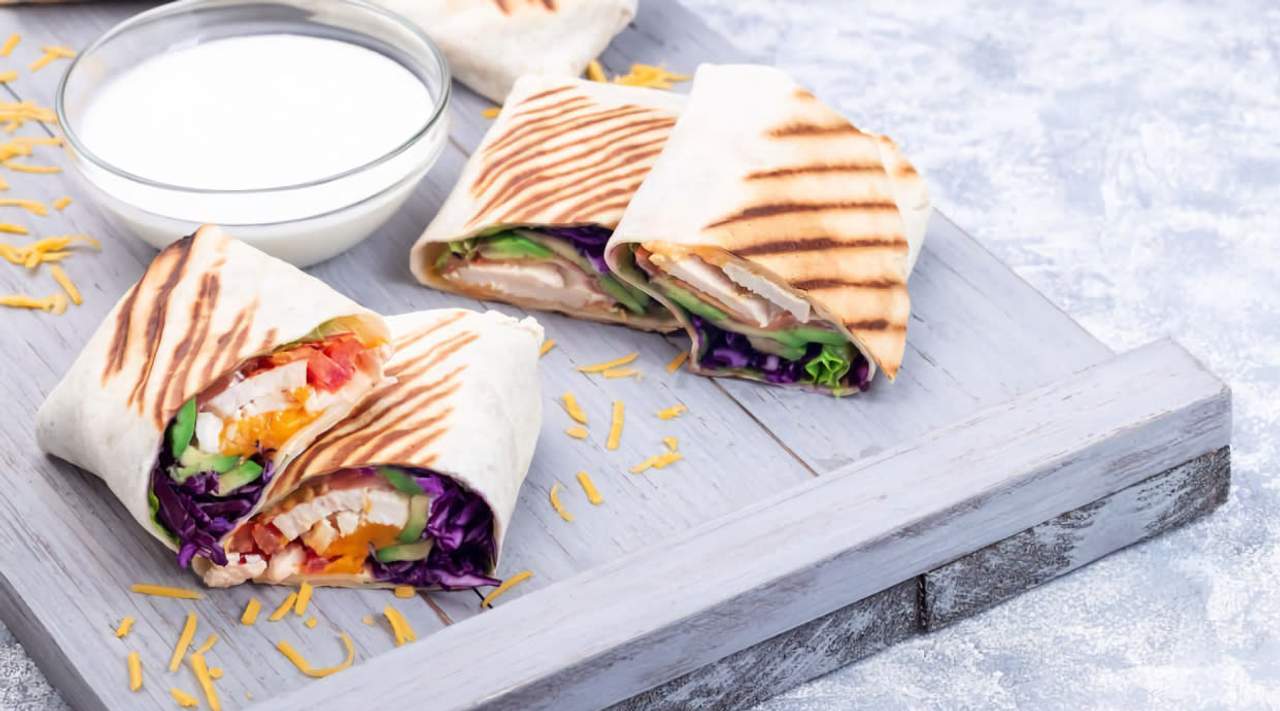 Pan enrollado, ternera o pollo, ensalada y salsas