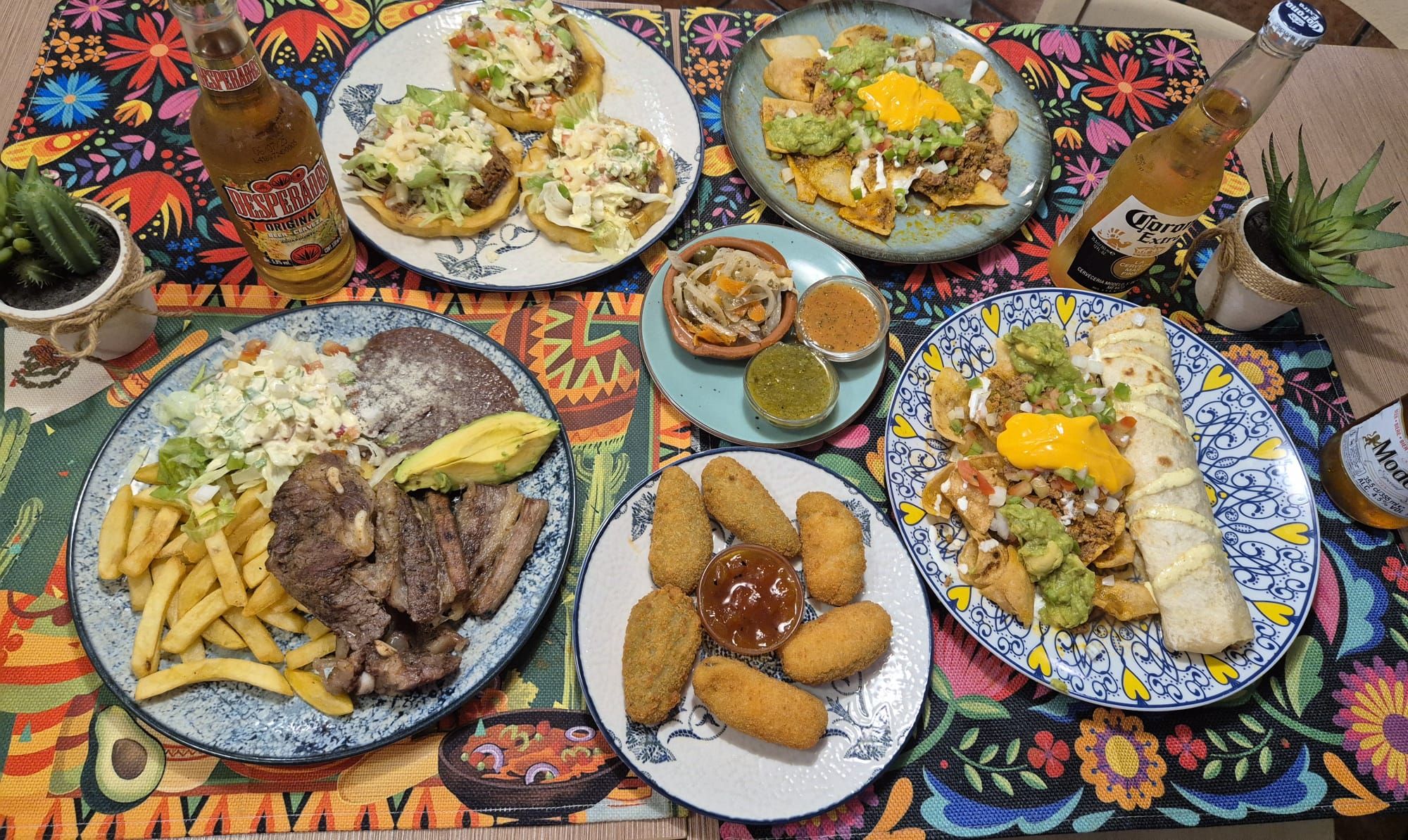 Churrasco de ternera, patatas fritas o tortillas de maíz, frijoles refritos, aguacate, ensalada de lechuga, tomate, cebolla, pimiento y aderezo