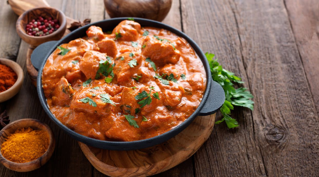 Plato típico de elaboracion hindú con salsa y especias recién molidas, con cebolla, pimiento, tomate, cilantro fresco y nata