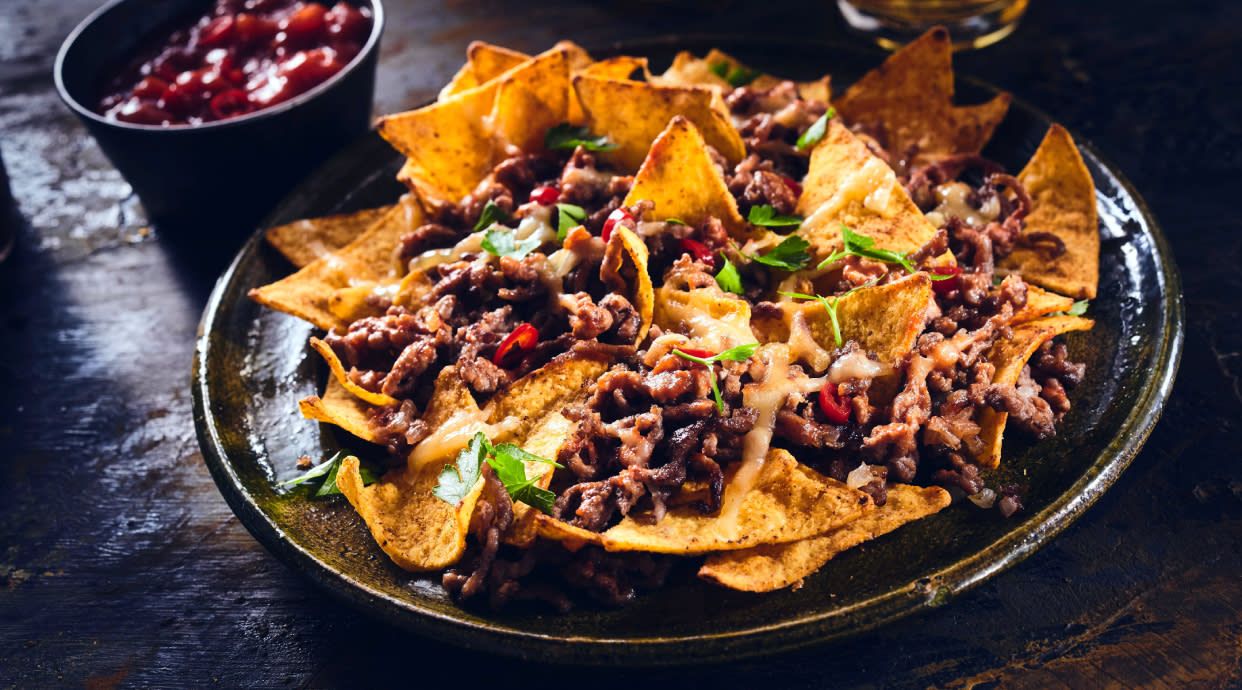 Carne picada de ternera con frijoles, queso mozzarella, cebolla y totopos