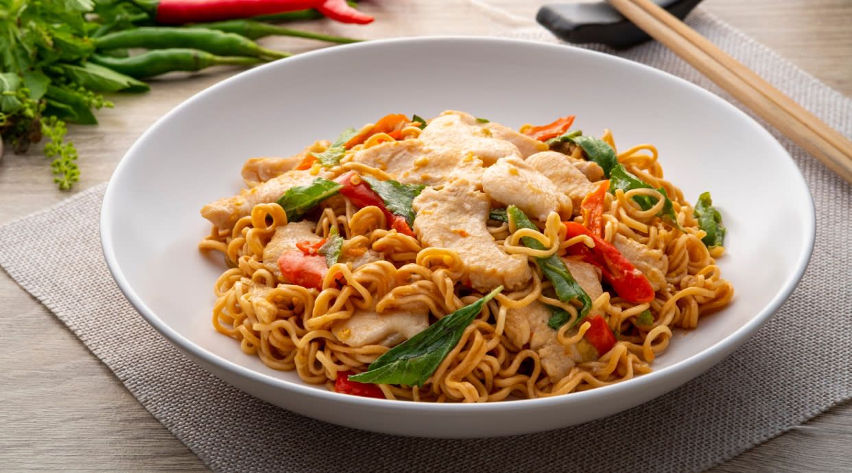 Pollo, pimiento en tiras, cebolla, tomate, salsa de soja, arroz, jengibre y cilantro