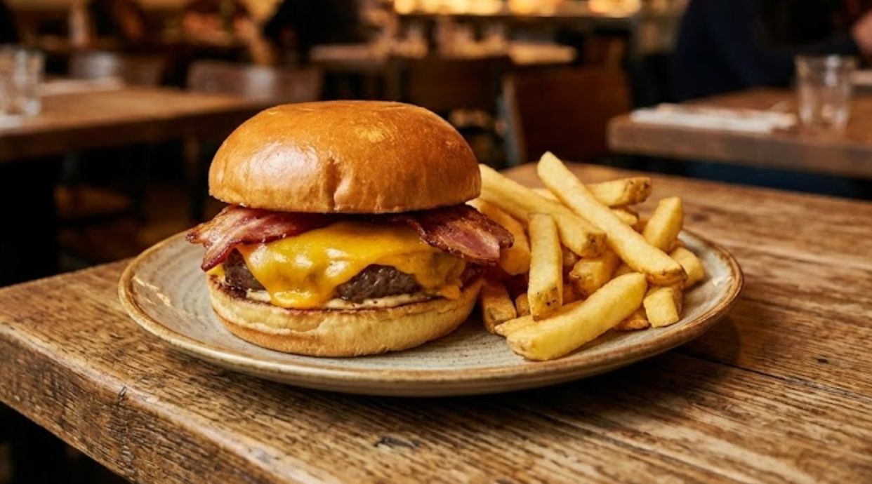 Hamburguesa de ternera acompañada de verduras frescas (lechuga y tomate).