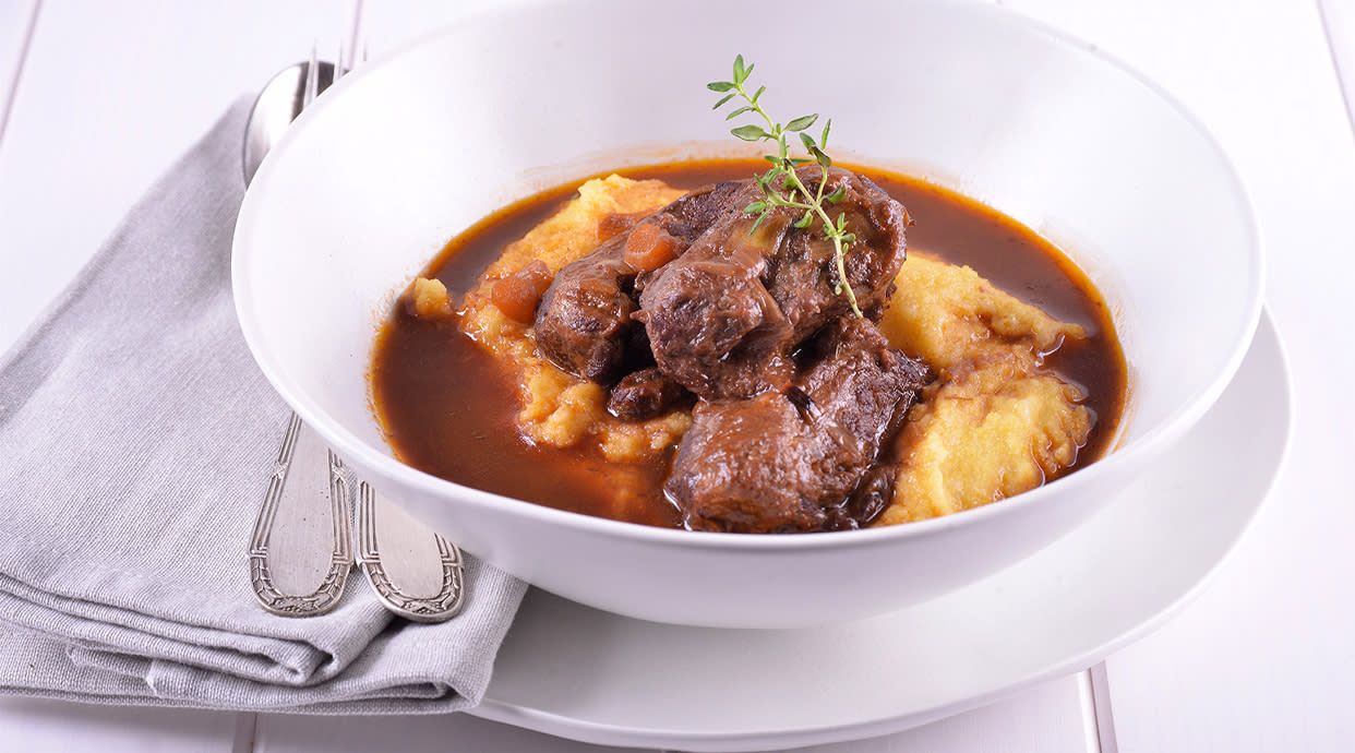 Con crema de patata, cebolla caramelizada y crujiente jamón.