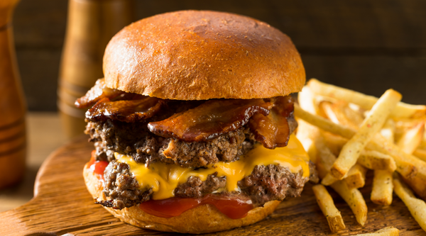 2 Pattys, doble de cheddar, mermelada de bacon y cebolla crujiente con patatas fritas