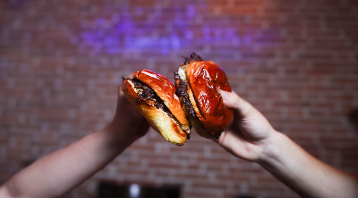 Pan brioche, doble carne smashed con cebolla caramelizada al momento, Cheddar ahumado, un toque de bacon crujiente, pepinillos y salsa de la casa