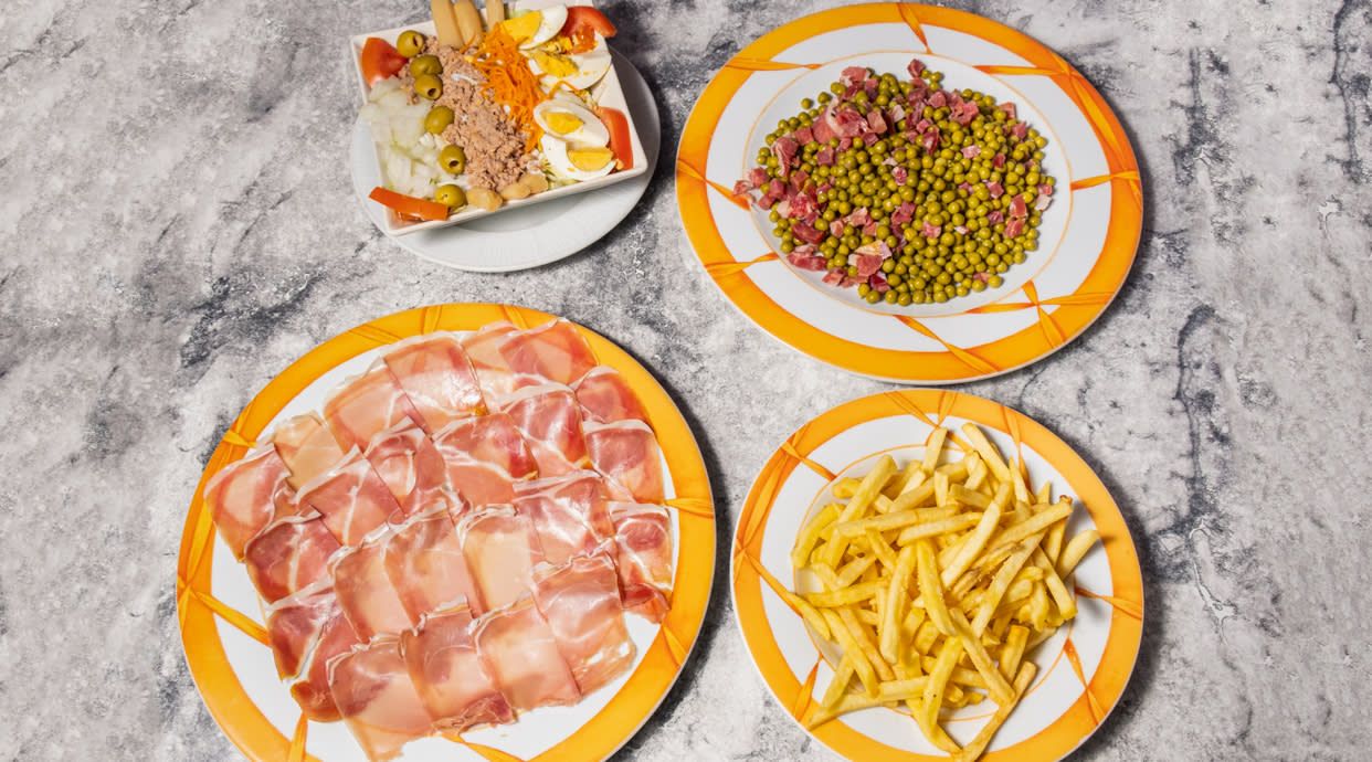 Ensalada de tomate con pepinillos,lomo fresco, huevos cocidos y patatas