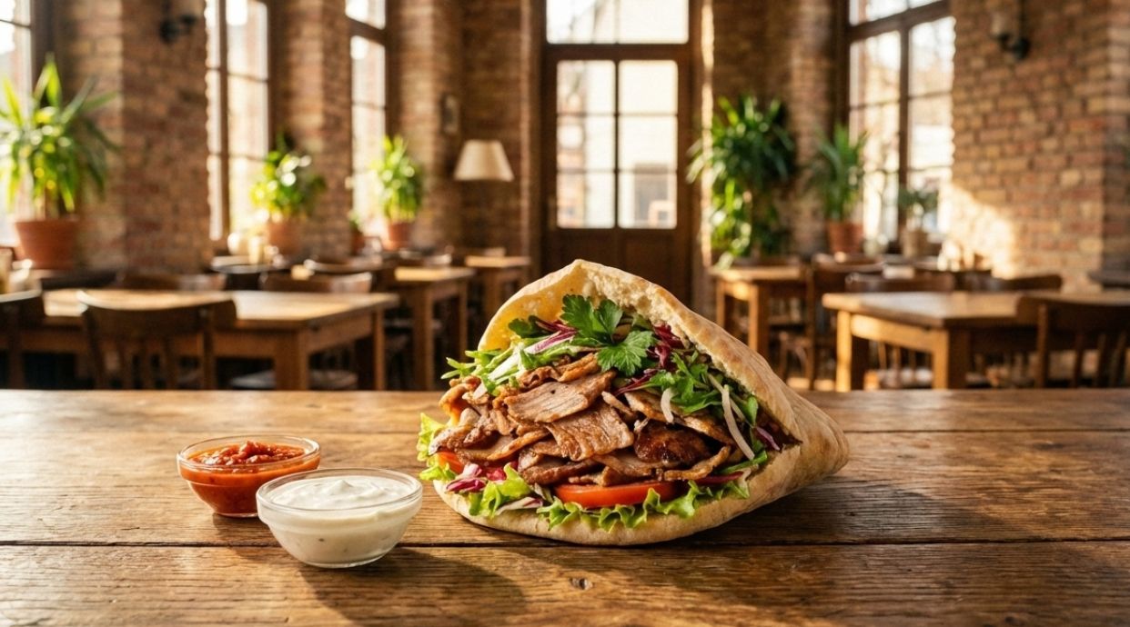 Carne de ternera en pan crujiente turco acompañado de lechuga, tomate, cebolla y nuestras sabrosas salsas
