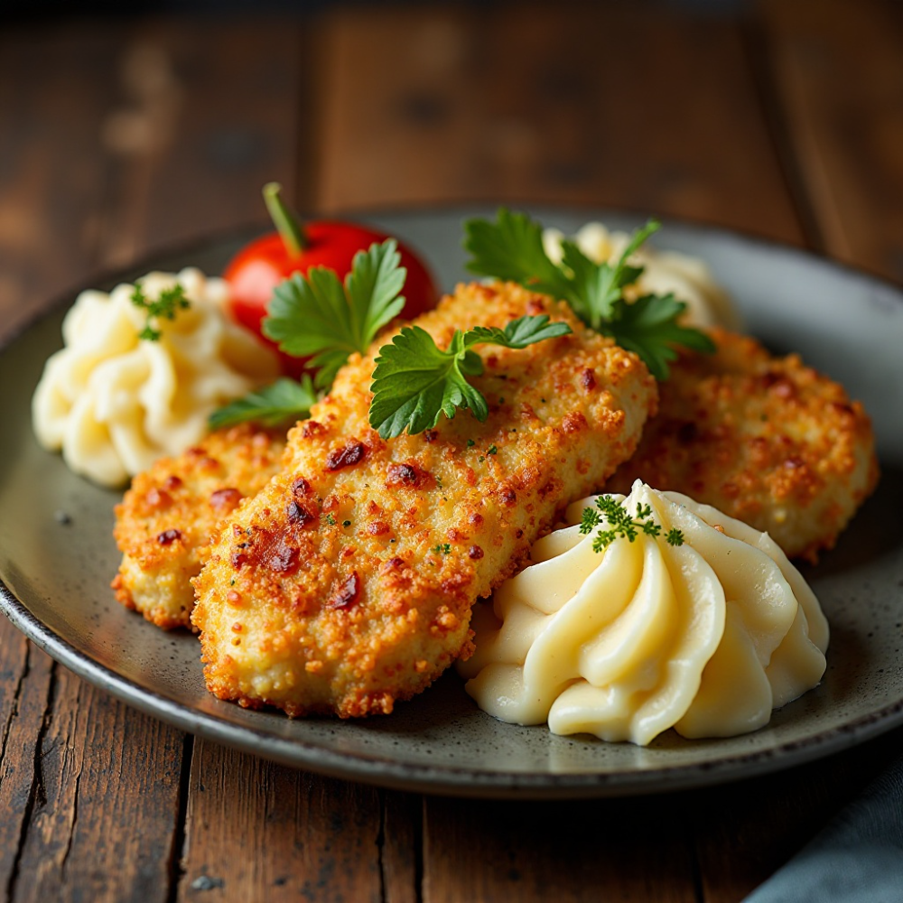 Golden, crispy chicken schnitzel served with buttery mashed potatoes and a touch of herbs — pure comfort on a plate. Chicken • Homemade • Comfort Food • Casero • Hecho con amor Weight: 450 g