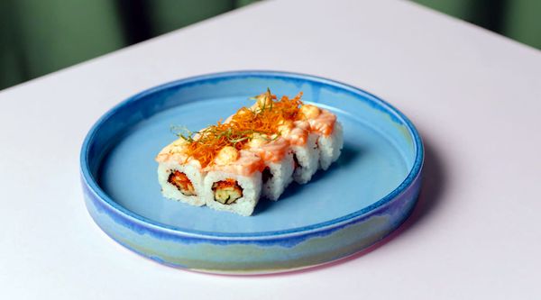 Salmó, alvocat enrotllat amb ceba fregida, salsa especial y salsa d'anguila