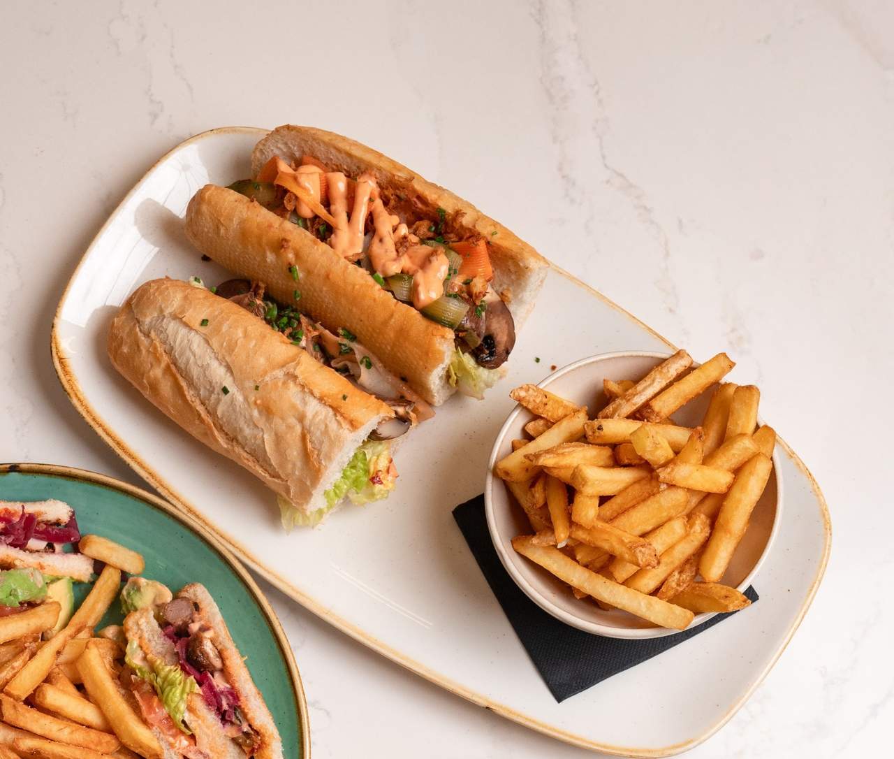 Spicy buffalo fried chicken burger, baby gem, sambal mayo, buffalo sauce, pickles, brioche bun & aggy fries.