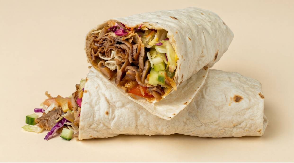 Tortilla de trigo enrollada con carne de kebab, tomate, zanahoria, maíz, cebolla, lechuga y salsa