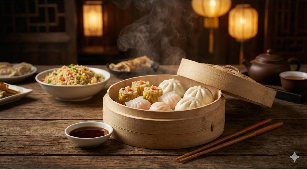 Selección de 4 uds. pollo con maíz, 4 uds. cerdo char siu cantonés y 4 uds. xiao long bao.