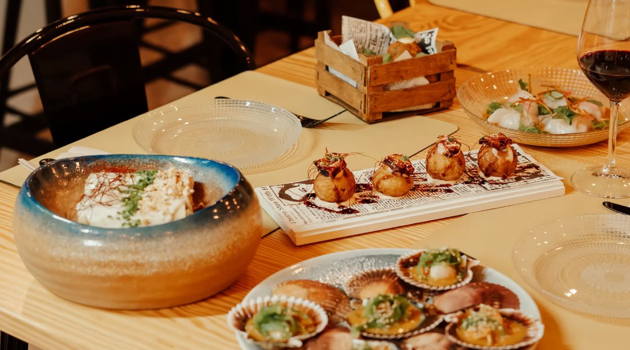 Con salsa teriyaki, mayonesa kimchi, pulpo y hierbas aromáticas