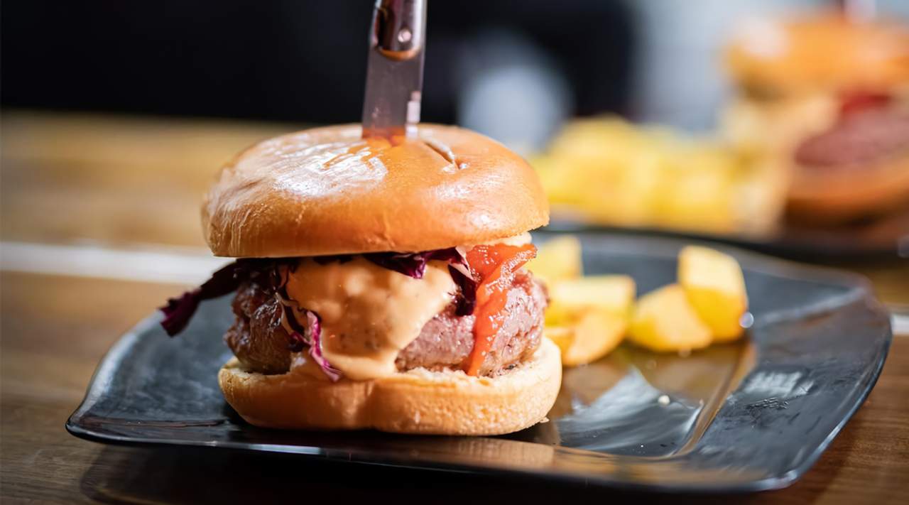 Carne de vaca madurada, queso curado, bacon, cebolla caramelizada y mayokimchi entre exquisito pan brioche de patata. Acompañada de patatas fritas.