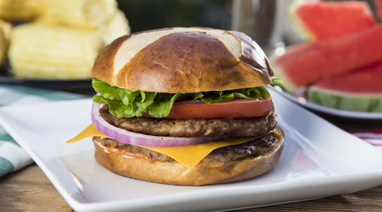 Amb brots verds, tomàquet doble burger amb formatge, salsa barbacoa i ceba cruixent, servit amb pa artesà.