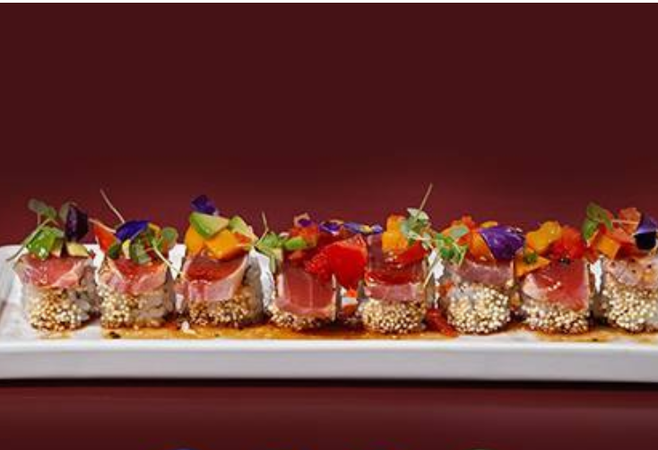Atún, mango, tomate, tobiko, salsa teriyaki, aguacate y Philadelphia