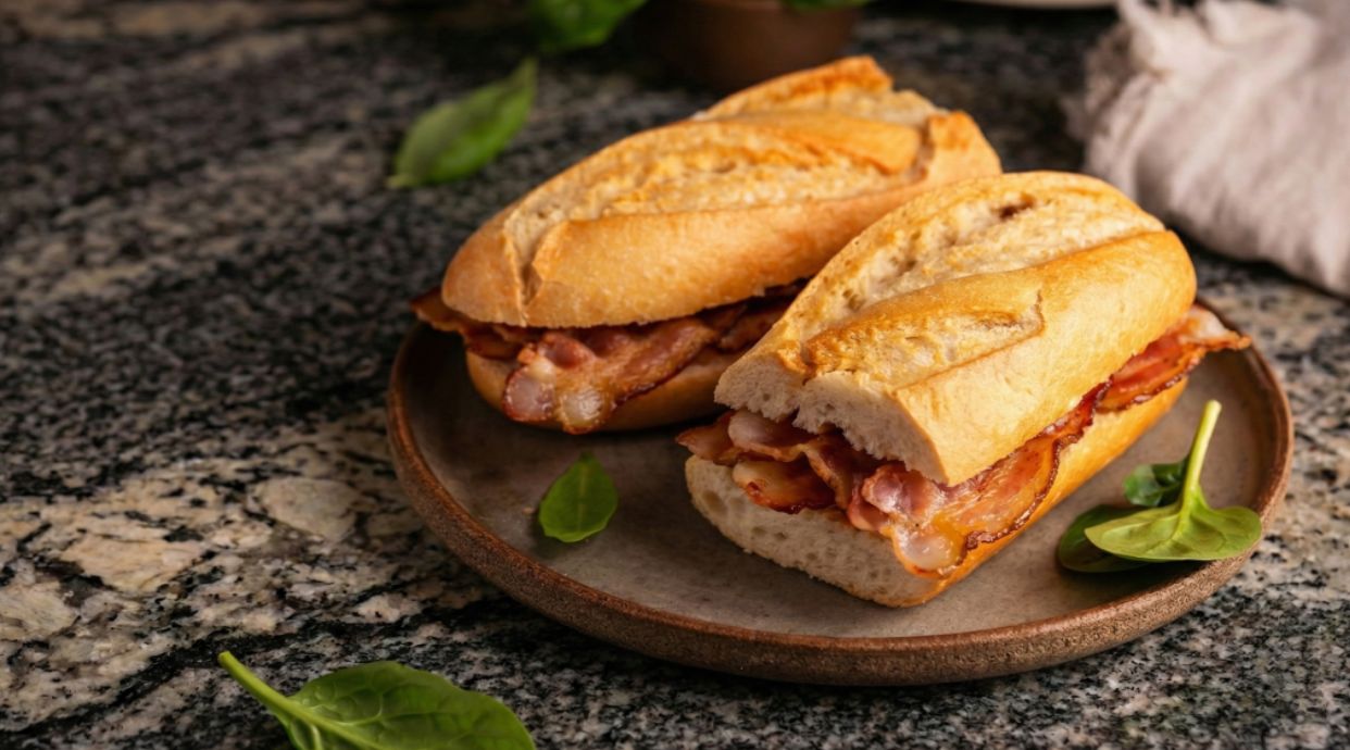 Mayonesa, lechuga, cebolla pochada, bacon y queso de cabra