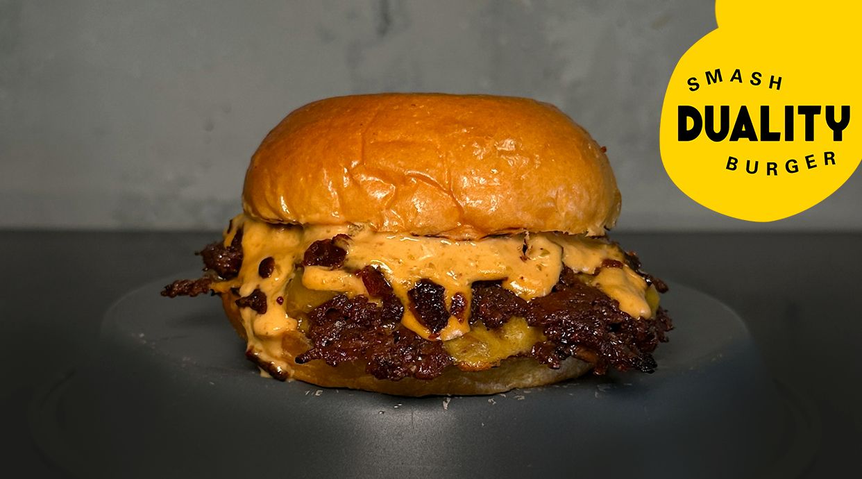 Doble de vaca smash, doble de queso cheddar, bacon crispy, salsa burger Duality Alérgenos: gluten (pan y salsa), leche (pan y queso), huevo (pan y salsa), soja y mostaza (salsa)