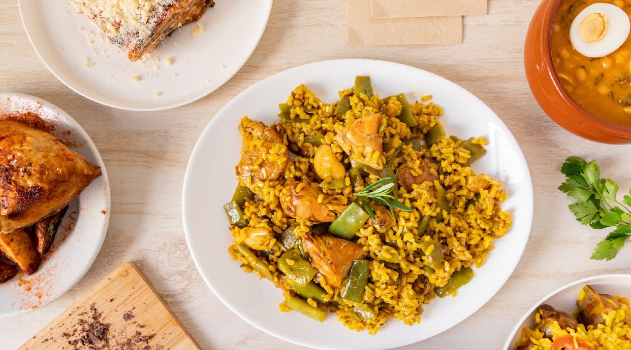 Con pollo, bachoquetas y garrofones. Una combinación perfecta de sabores mediterráneos en un arroz amarillo lleno de sabor y tradición.