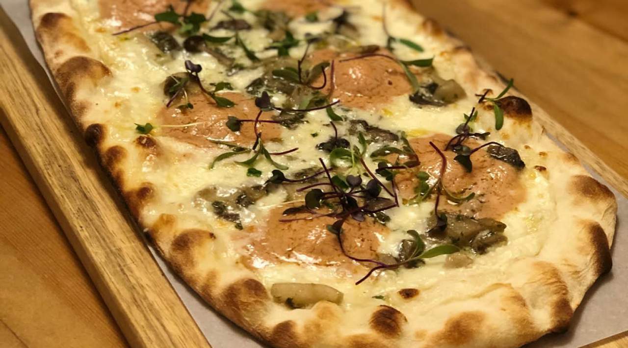 Salmó fumat, crema de formatges, mozzarella i ruca amb un toc de llimona