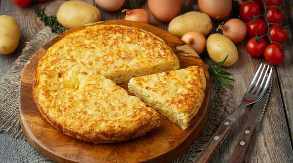 Pimiento verde, cebolla caramelizada, jamón serrano, patatas, cebolla y huevos