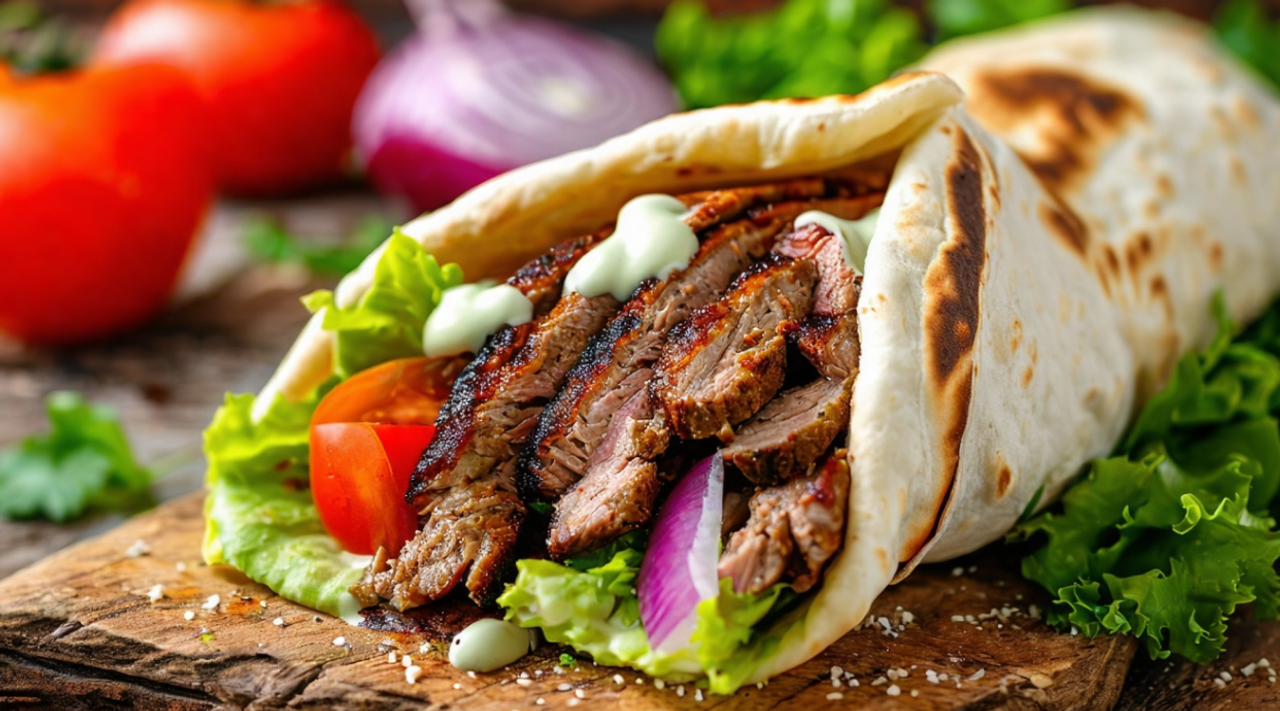 Pita rellena de pollo o ternera con cebolla, tomate, aceitunas, zanahoria