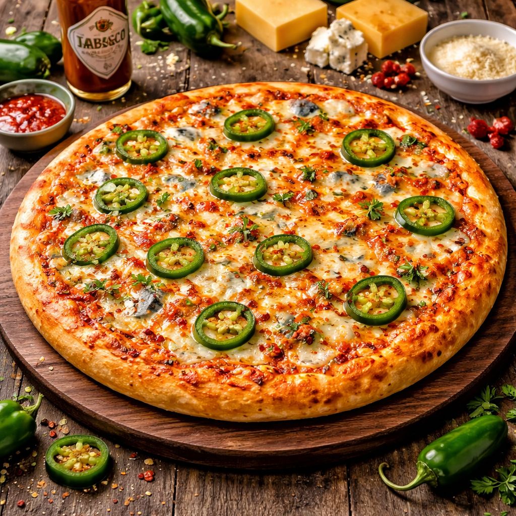 ტომატის სოუსი, მოცარელა, პეპერონი, ბეკონი, შავი ზეთისხილი, ხალაპენო, ტაბასკო