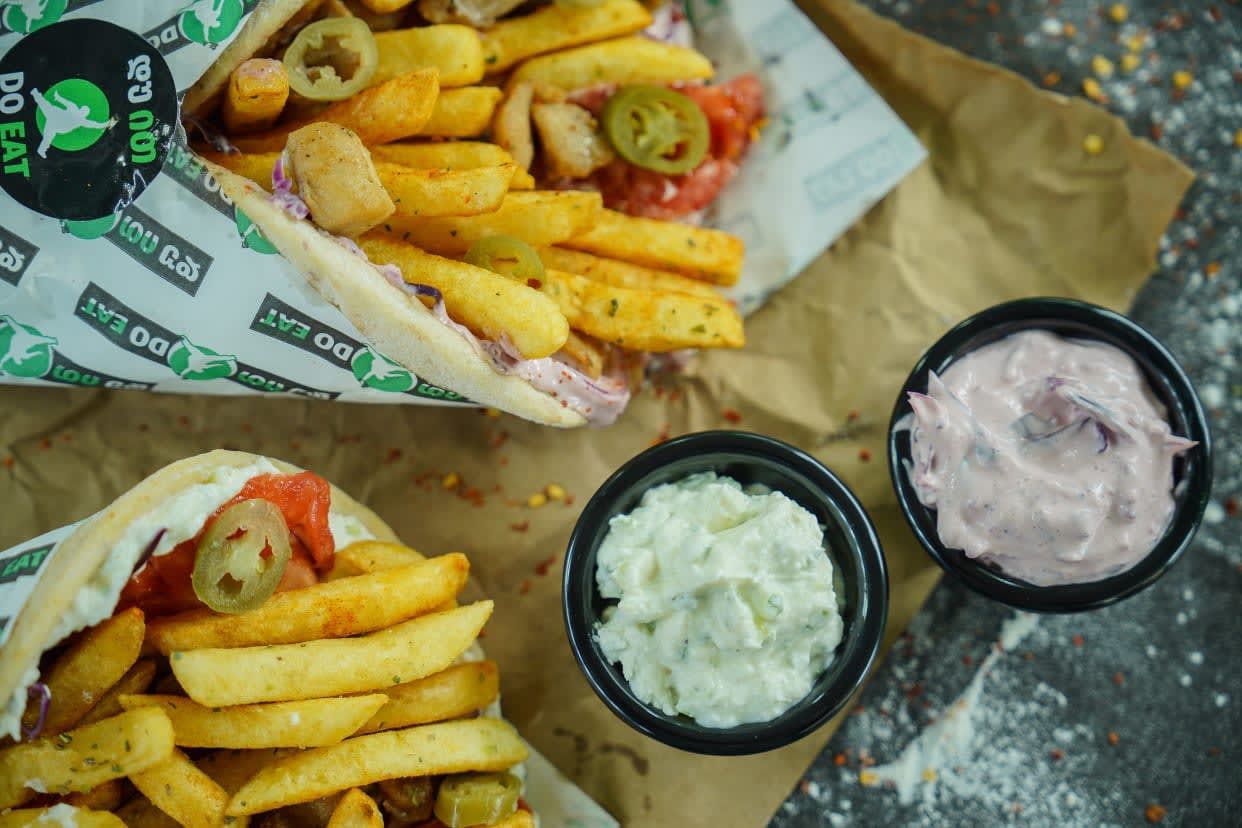 პიტა,ფრი, ქათმის და ღორის ხორცი,ძაძიკი, ჰალაპენიო, პომიდორი, ხახვი, იასამნისფერი კომბოსტო.