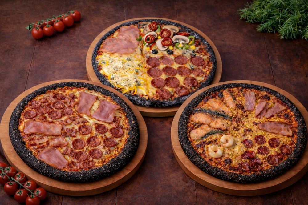 პომიდვრის სოუსი მოცარელა პეპერონი სალიამი ლორი ინდაურის ლორი კრევეტები შებოლილი ორაგული )(ორაგული