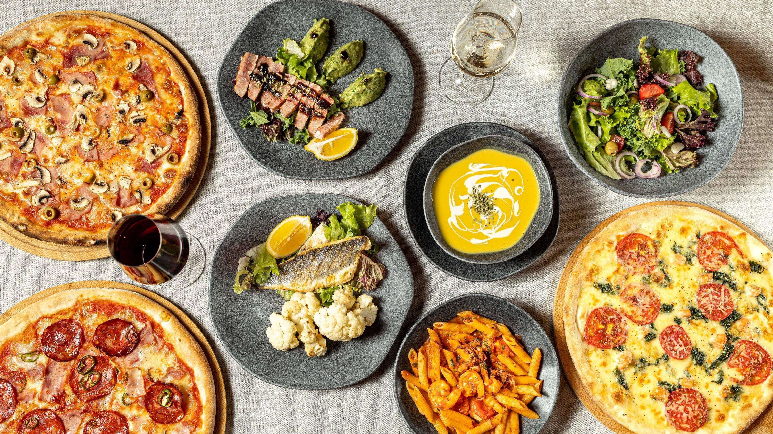 (tomato sauce, cream, shrimps, greens, vodka)