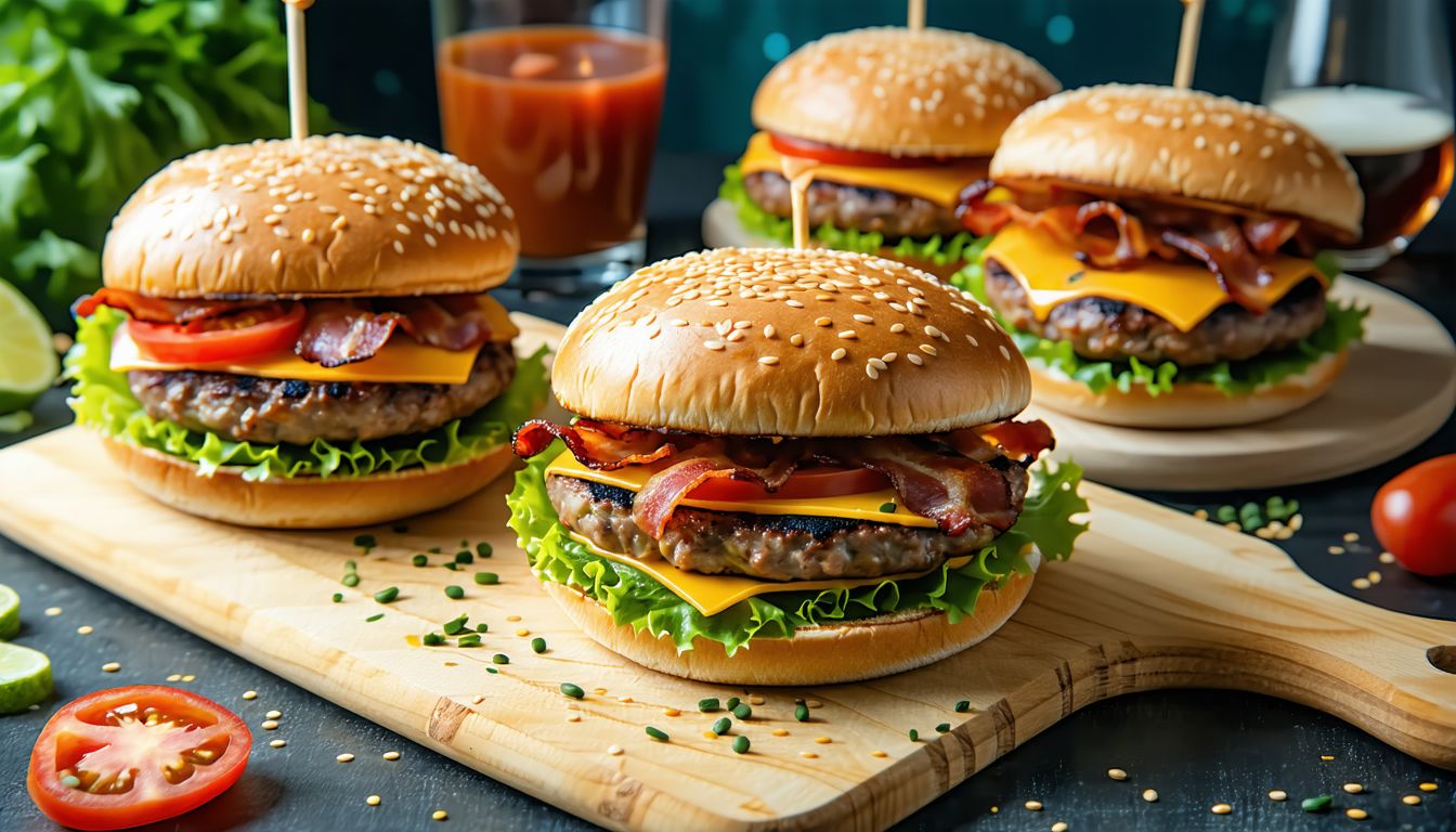 Pljeskavica 150g, sir cheddar, sir gauda, pečena slanina, svježa rajčica, zelena salata, kolutići mariniranog luka, ketchup, cocktail sos. Uz burger krumpirići gratis. S krumpirićima ili coleslaw salatom