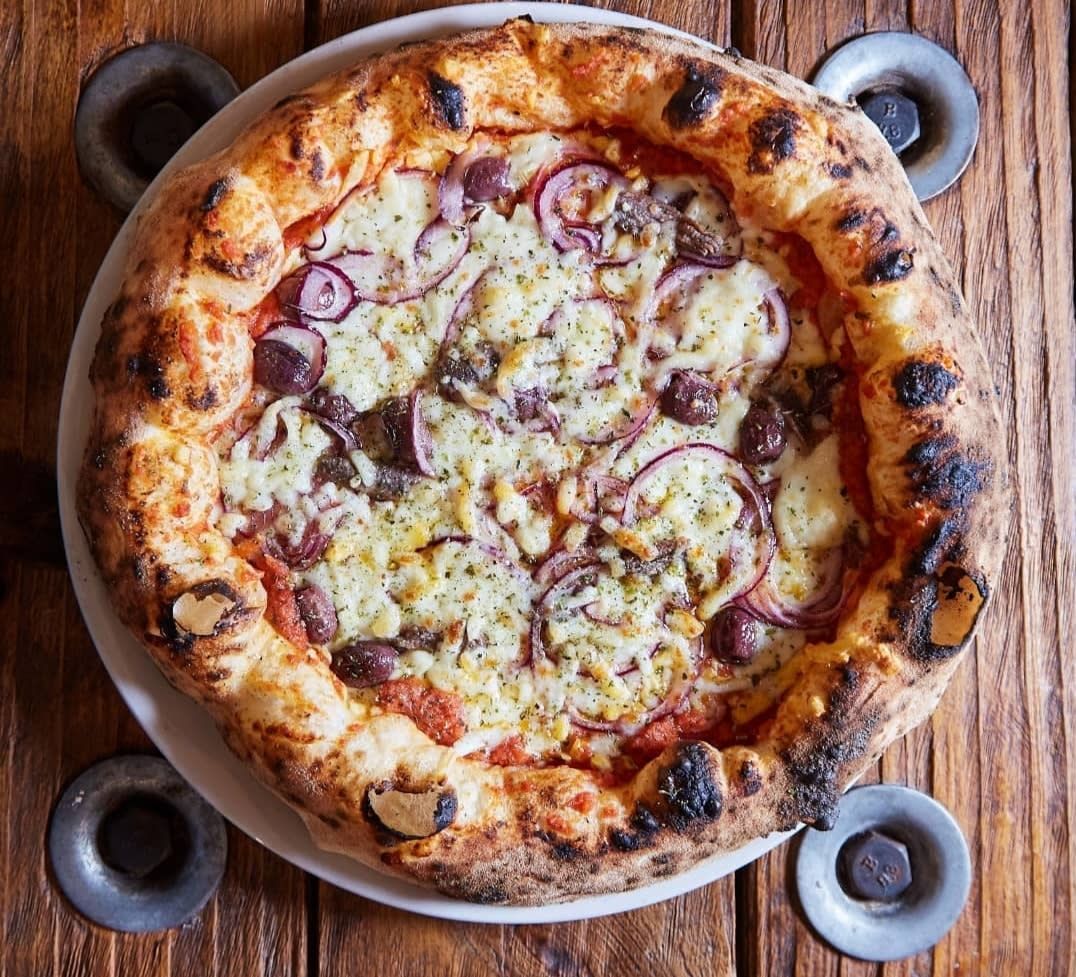 Pomodoro pelato, Fiordilatte sorrentina, acciughe di trapani, olive nere del belice, origano fresco, olio evo