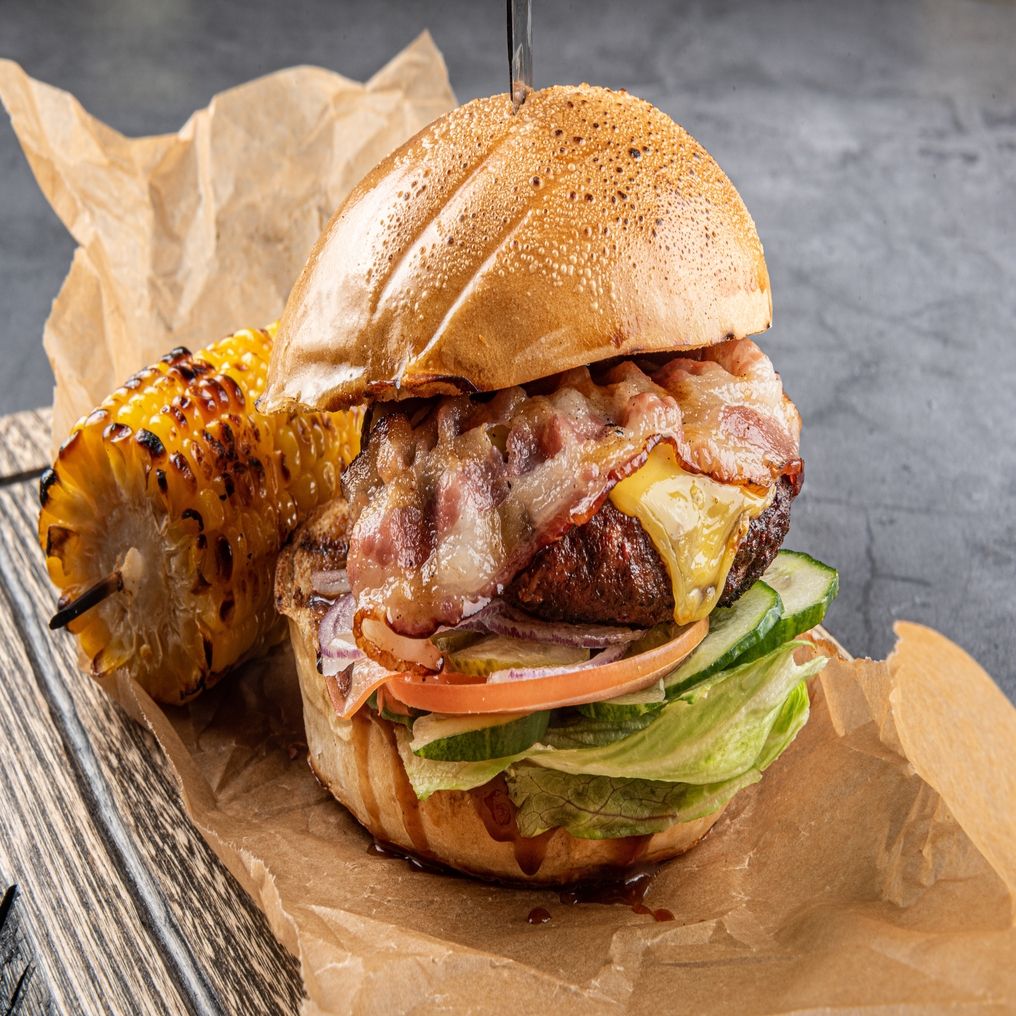 Panino con hamburger, provola affumicata, bacon e patatine fritte