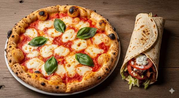 Piadina con kebab, verdure, salse, patatine fritte e una bevanda a scelta