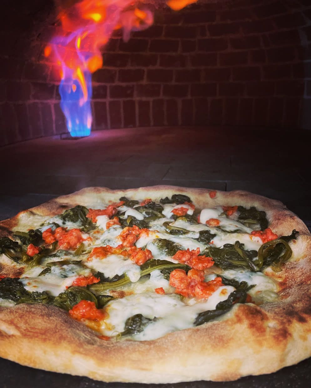 datterini gialli, gorgonzola, olive schiacciate, guanciale, mozzarella, basilico, olio evo.