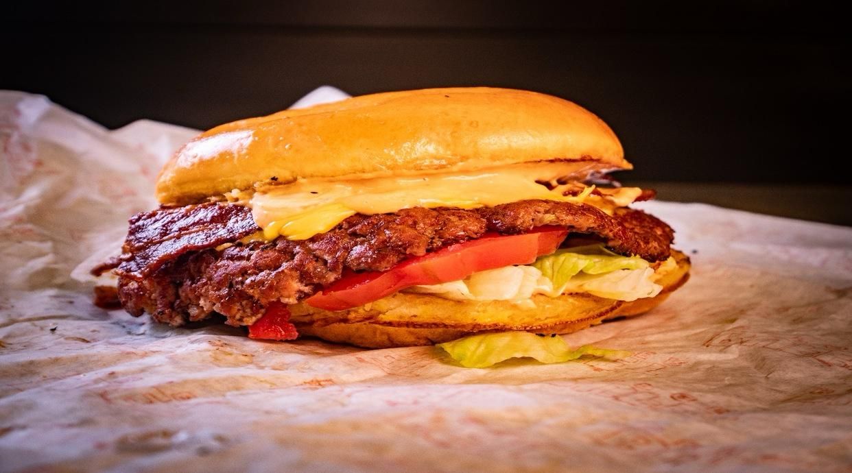 Pane, burger di manzo, insalata, pomodoro, cipolla, bacon, cheddar, salsa bufét burger e a scelta single, double o triple