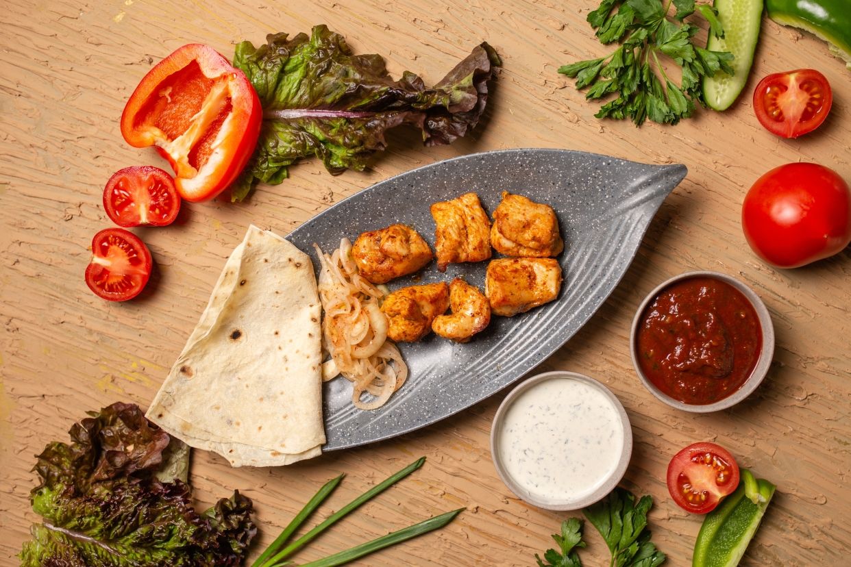 Carne di vitello e tacchino, insalata, pomodoro, cipolla, salse