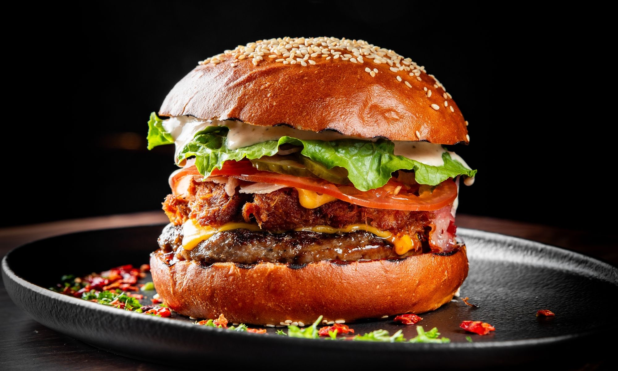Smash Burger doppio 200 g, insalata, cheddar, bacon, salsa burger, pane bun artigianale di patate