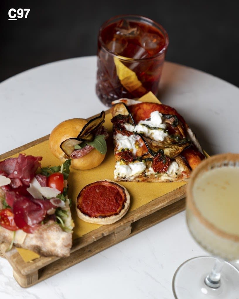 Focaccia, mortadella, burrata, pistacchio, pomodori confit, pesto al basilico