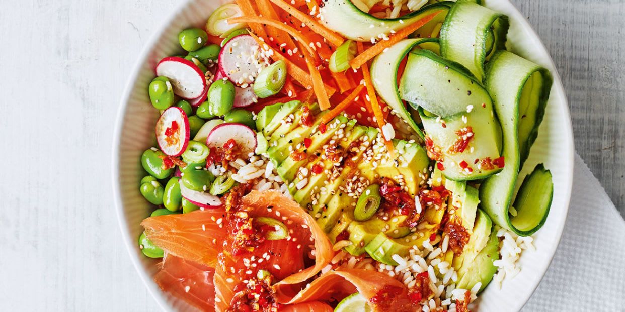 Salmone, avocado, edamame, carota, wakame, riso sushi, mango e sesamo