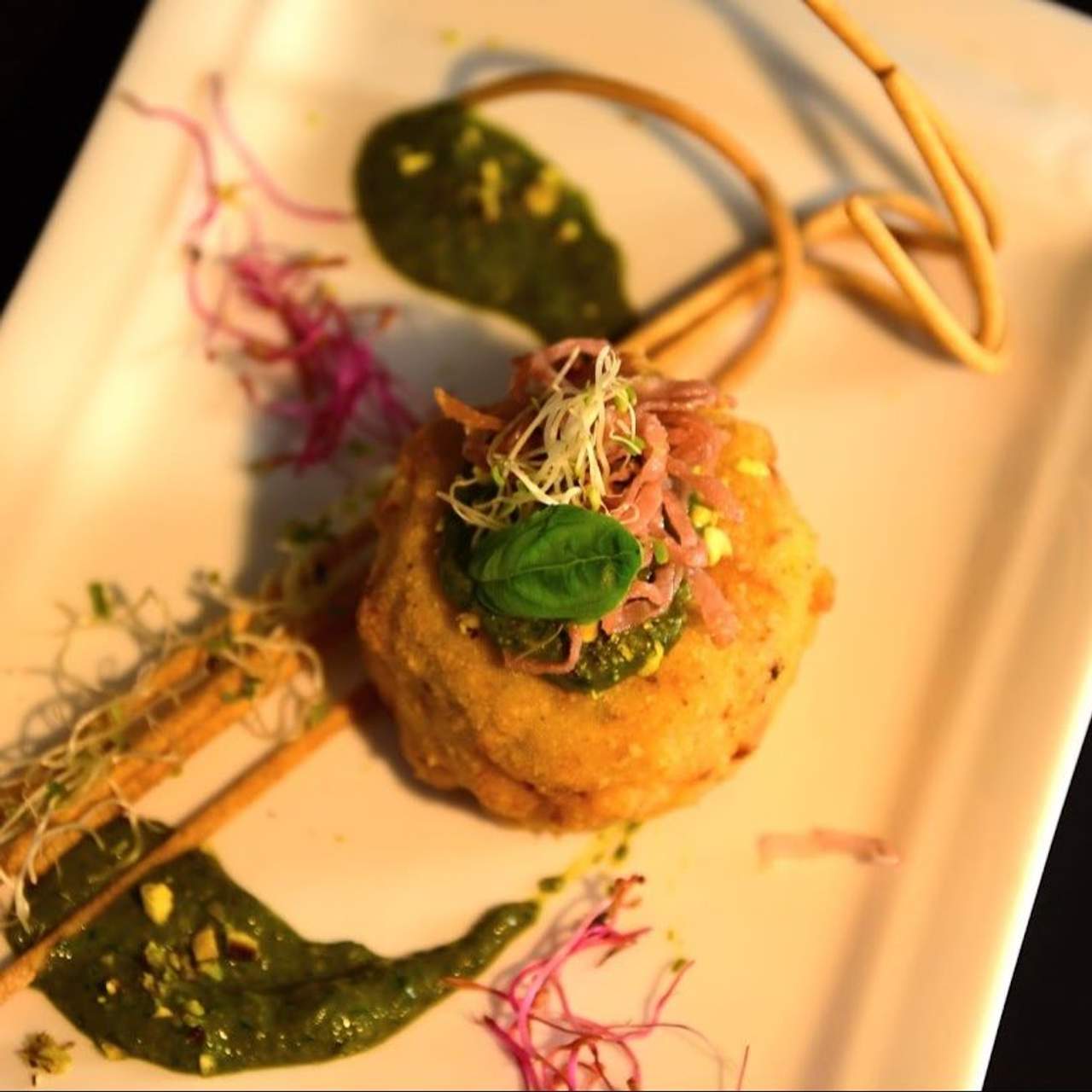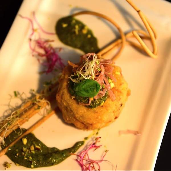 Fiordilatte, crocchè , prosc. cotto, fonduta formaggio e basilico
